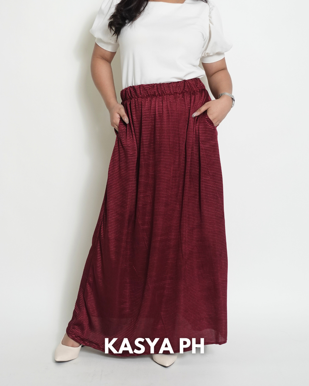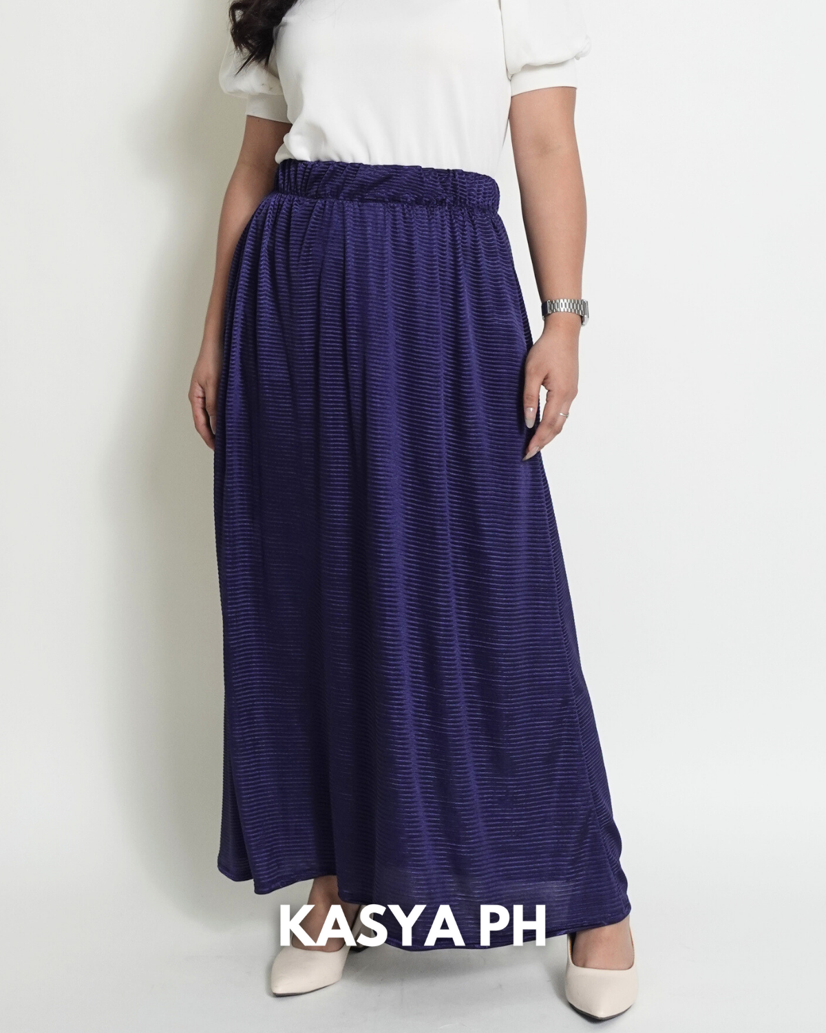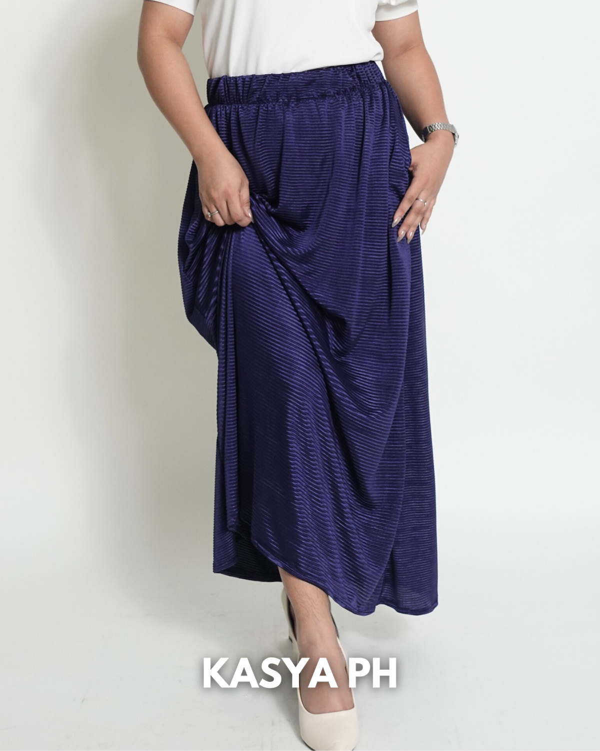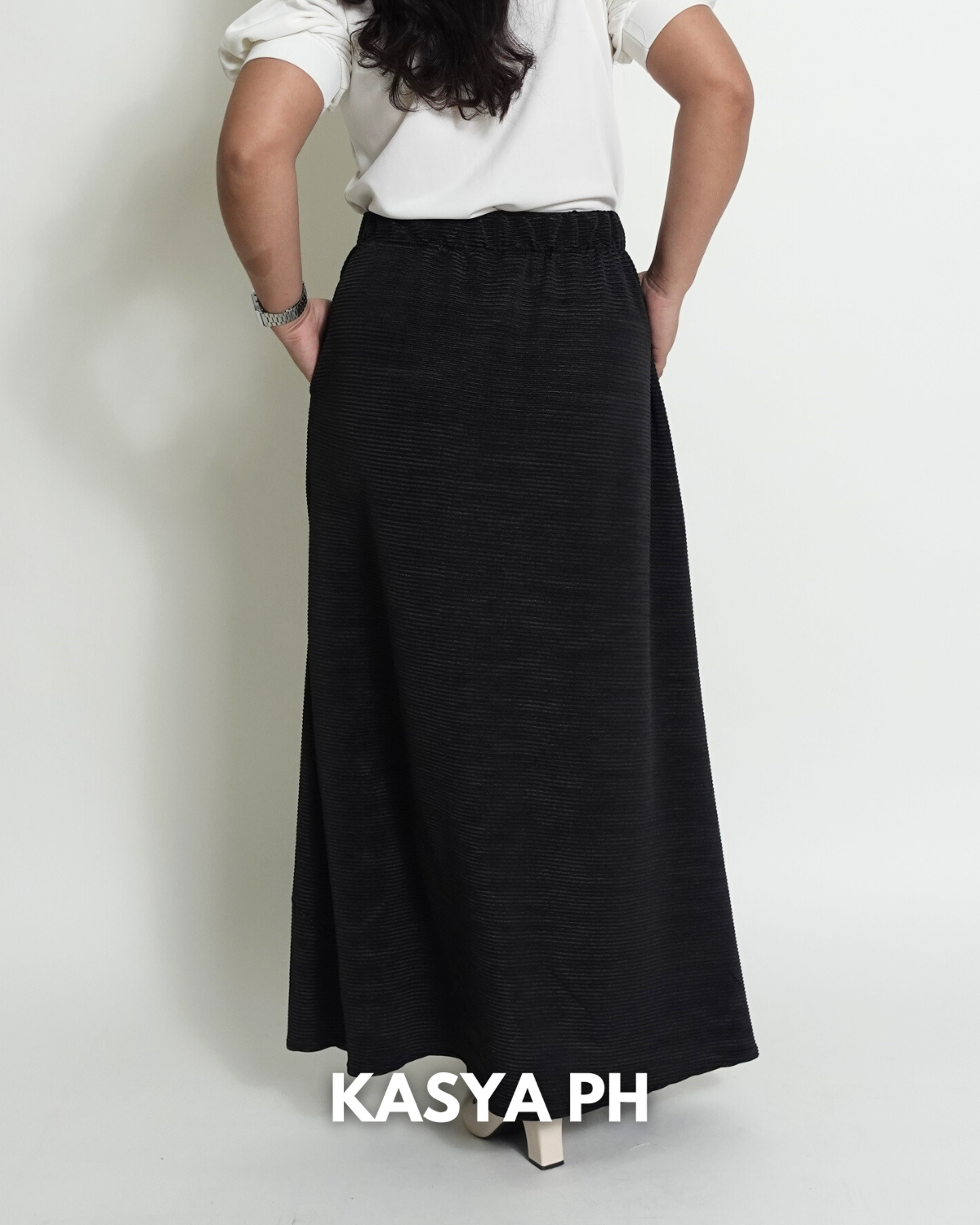 This skirt sits securely at the waist, falls gracefully below the knee, and moves naturally without wrinkling easily. Whether you pair it with blouses, polos, sandals, or heels, it delivers a polished look without trying too hard.