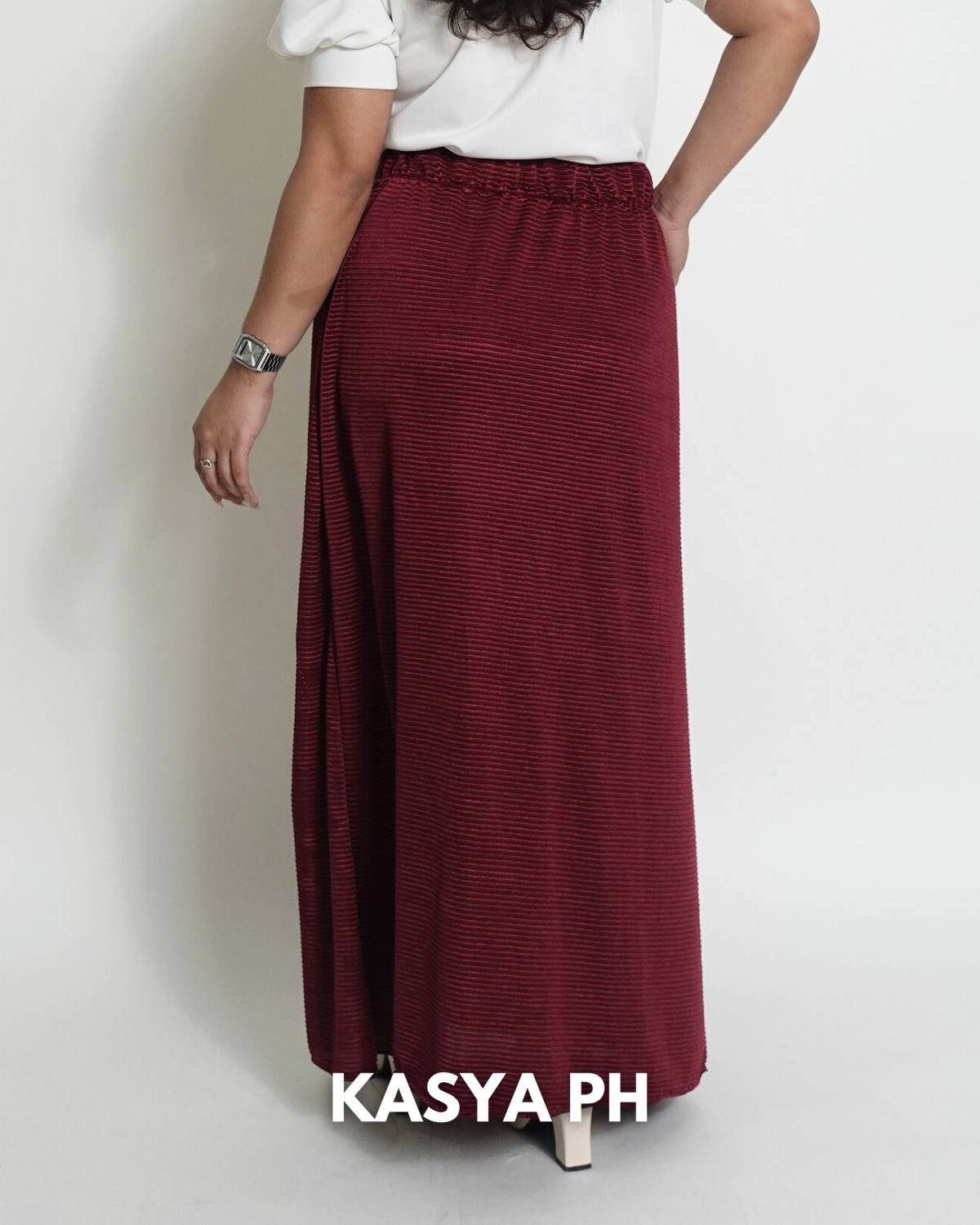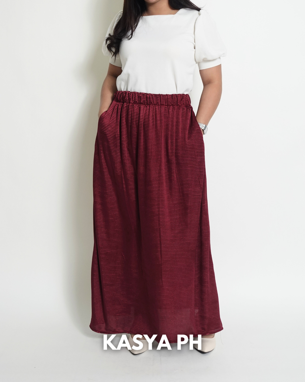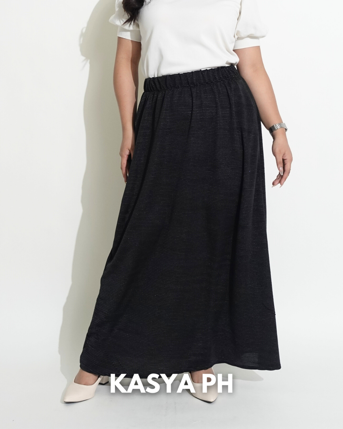 This skirt sits securely at the waist, falls gracefully below the knee, and moves naturally without wrinkling easily. Whether you pair it with blouses, polos, sandals, or heels, it delivers a polished look without trying too hard.