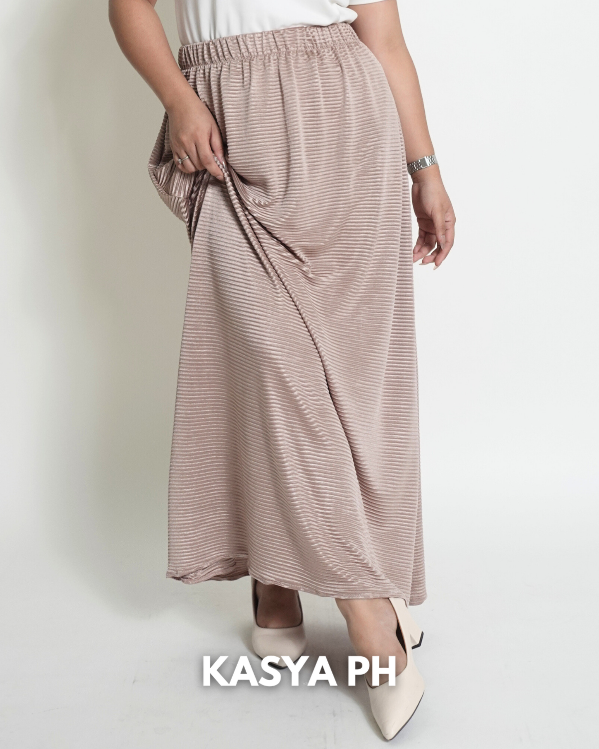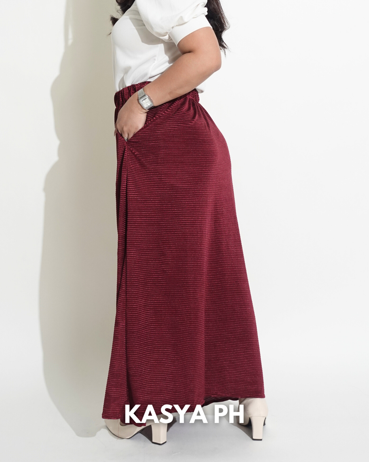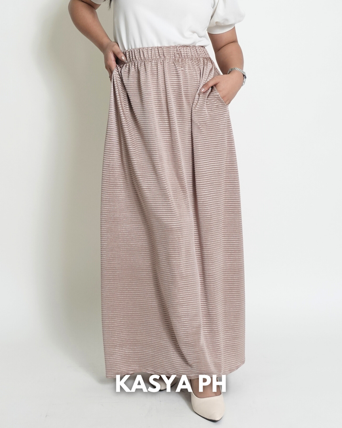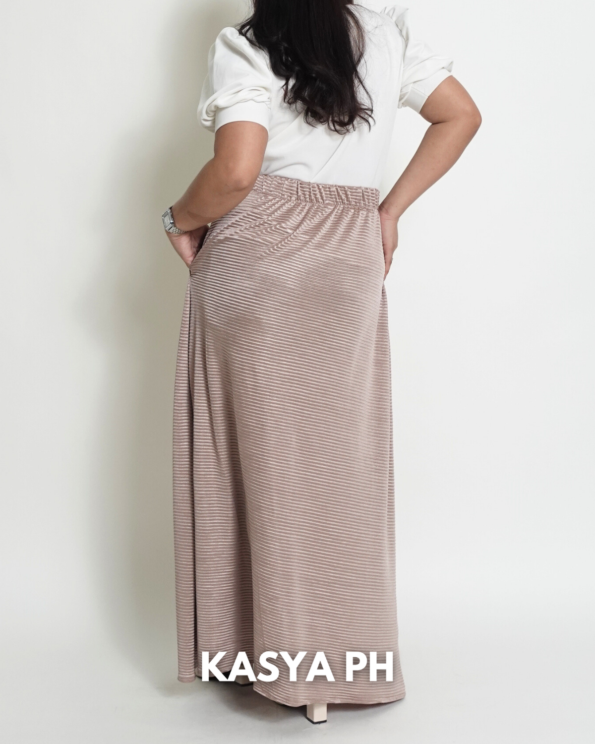 This skirt sits securely at the waist, falls gracefully below the knee, and moves naturally without wrinkling easily. Whether you pair it with blouses, polos, sandals, or heels, it delivers a polished look without trying too hard.